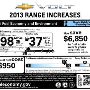(3BL Media) Detroit, MI – June 8, 2012 – The all-electric vehicle range of the 2013 Chevrolet Volt will be 38 miles on a single charge, providing owners with a three-mile EV range increase from the 2012 model. The miles per gallon equivalent (MPGe) will increase from 94 miles to 98 miles and the total range, including extended range operation, will be 380 miles.