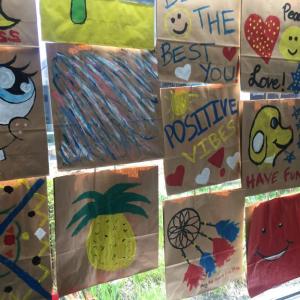 Jaquae was decorating his bag with some Popsicle sticks. “I’m going to get 3D with it,” he said, showing off his painting of a cheerful, two-story home surrounded by hills. Kiyanne chose a text-based concept, painting in bold, colorful brushtrokes words like “Hope” and “Faith.”