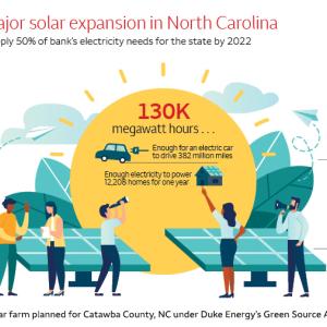 As Wells Fargo continues to ramp up efforts to respond to our planet’s climate crisis, the company has announced another major solar expansion, this time with our North Carolina neighbor Duke Energy. Under a 20-year renewable energy purchase agreement, Wells Fargo will receive 100% of the output from a planned 600-acre solar farm in Catawba County. The project will supply more than 50% of Wells Fargo’s electricity needs in North Carolina and approximately 8% of the company’s annual global electricity requirements when it comes online in 2022.