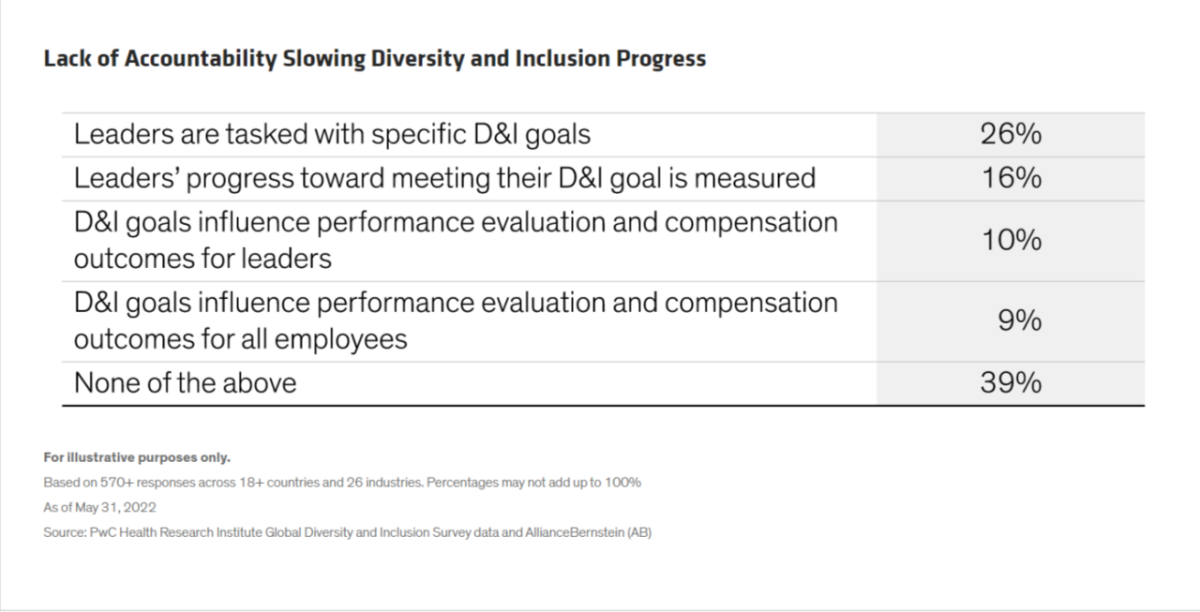 Many companies fail to capture the benefits of DEI, despite its proven connection to bottom-line performance. Lack of accountability is a big reason. Even among companies with DEI initiatives, only 26% of senior leaders are tasked with specific DEI goals. Even fewer are focused on reaching DEI targets or applying them to leadership or employee performance evaluations (Display).