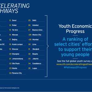 New York, NY, November 23, 2015 /3BL Media/ – A new Economist Intelligence Unit (EIU) research initiative, commissioned by the Citi Foundation, reveals that youth – while optimistic and entrepreneurial – struggle to find employment, access to technology, pay equity and support networks that can help them thrive in cities around the globe. Accelerating Pathways offers a comparative snapshot of youth perceptions of their economic prospects in 35 cities around the world and identifies which factors contribute most to an enabling economic environment for young people. The research also includes an interactive tool that can be leveraged by policy, business and civic leaders.