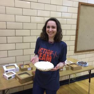 Everyone who made a donation to the Action Team’s efforts, was entered in the Pie Walk, which involved walking around a series of circles, each keyed to a different donated pie, that were set up in the school gymnasium. When the music stopped, the participants received the pies that corresponded with the circle where they stopped.