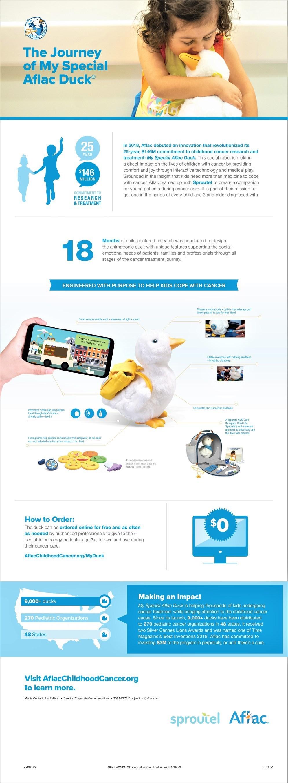 This month, Aflac is also introducing the latest innovation for My Special Aflac Duck, a robotic duck designed to help children cope with cancer. The company again teamed up with Sproutel, a patient-centered design studio, to create a new care kit that includes medical play accessories that child life specialists can use as part of their program to help children cope with their treatments. Although the new play accessories were originally intended solely for child life specialists, the company decided to include them in future My Special Aflac Duck orders for all child cancer patients, as well. To date, Aflac has provided more than 9,000 My Special Aflac Ducks to children ages 3 and over at more than 270 hospitals and childhood cancer organizations across the nation.
