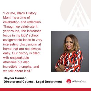 Daynor has been with Alliance Data for 2.5 years and is passionate about mentoring first generation lawyers as a way to pay it forward to the woman who inspired her to pursue a career in law. She helps them with interviewing skills and resume prep through the Diverse Attorney Pipeline Program - DAPP which helps first-year law students get placed with internships. She is also active with the Black Women Lawyers' Association of Greater Chicago, Inc., having served as Treasurer and currently serving on the Corporate Counsel Committee and the Elections Rights Committee. She’s especially proud of the work they did around this year’s election education, as well as the efforts they made to help diversify the legal profession in Chicago. Daynor is also on the board of a non-profit that is the oldest continually operating child welfare organization in the State of Illinois, proving a wide array of services to a population that is predominately Black and brown.
