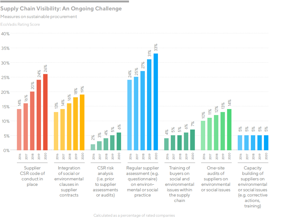 Concerningly, these statistics accord with data assessed in the latest EcoVadis Business Risk and Sustainability Index, which found that only 5% of companies rated by EcoVadis in 2020 support suppliers in building due diligence capacity further up the value chain. Just 6% conduct CSR risk analyses prior to supplier assessments or audits, while only 7% provide buyers with specific training on social and environmental issues in the supply chain.