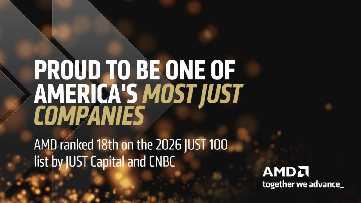 AMD has been named to the 2026 JUST 100 list of America’s Most JUST Companies by JUST Capital and CNBC, ranking 18th overall. The recognition reflects the company’s continued progress in advancing responsible business practices and delivering positive impacts for employees, customers, communities, the environment and shareholders.