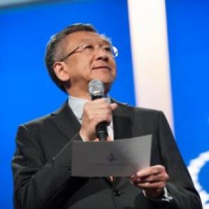Amway China President Audie Wong stands on stage at the Clinton Global Initiative. His team has built partnerships that have resulted in 754 “Nutrition Kitchens” built through the Spring Sprouts project.