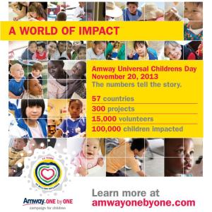 Since the AMWAY ONE BY ONE® campaign launched in 2003, its focus has been to assist children in need around the world. In just 10 short years, Amway business owners and employees have impacted the lives of 10 million children, logged 2.7 million volunteer hours, and raised $190 million for programs.