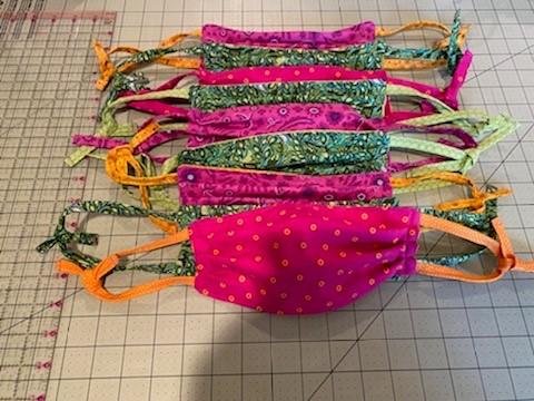 The masks are rectangular, with pleats to go over the mouth and a top and bottom tie. Originally, the ties were made from a rubber band, but after wearing this for many hours, it actually starts to rub the wearer. And, the elastic is hard to come by.A number of healthcare practitioners find it more comfortable to wear cotton ties which they can tie around their ears or head in a more comfortable way. We’re focused on creating the ties to hold the mask in place.