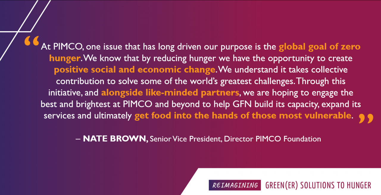 “We understand it takes collective contribution to solve some of the world’s greatest challenges. Through this initiative, and alongside like-minded partners, we are hoping to engage the best and brightest at PIMCO and beyond to help GFN build its capacity, expand its services and ultimately get food into the hands of those most vulnerable.”