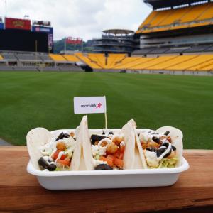 - Quinoa Tacos (Heinz Field) – Tri color quinoa topped with tomato, spiced garbanzo beans, queso fresco, black olives and cilantro cream.