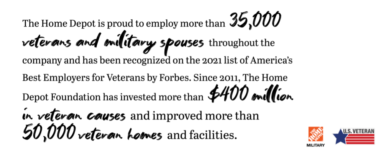 To learn more about our veteran initiatives, visit HomeDepotFoundation.org. If you’re a veteran looking for career opportunities at Home Depot, visit www.careers.homedepot.com/military.