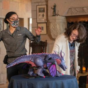 The dragon’s appearance and behaviors are based on ideas Belle suggested during the concept and design phase of the project and draw upon her own artwork and characters from her favorite books and movies.