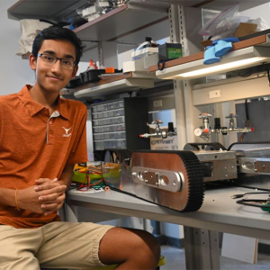 UT Austin freshman Siddharth Thakur captured the People’s Choice Award (and a $2,000 prize) for developing a remote-controlled search-and-rescue robot. The Firebot is a wirelessly managed, thermally insulated, obstacle-climbing robot that can locate people trapped in burning buildings. Firefighters can deploy Firebot near an entrance and remotely steer it using a joystick and laptop displaying live video, thermal imagery and sensor data, which warns of potentially hazardous situations. Firefighters can use a two-way speaker to lead conscious victims out, or a siren and GPS map to allow them to quickly find and rescue unconscious victims, helping to mitigate risks and save lives.
