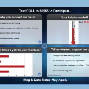 m2Screen displays supporter’s responses to questions on a large screen at your event. Simply collect real-time feedback through text message and the m2Screen tool will enable you to display open-ended replies and polling charts on screen. You can also display funds collected through text message donations as you receive them through the donation thermometer. This tool is a perfect compliment to your next run, walk, ride, luncheon or conference!