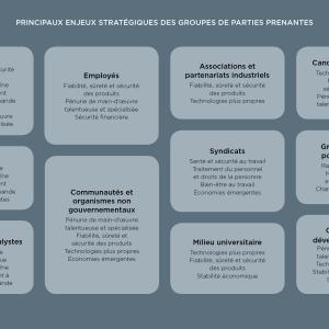 Notre engagement auprès de nos parties prenantes nous aide à développer notre stratégie d’entreprise, et à la peaufiner en permanence. Mobiliser un large éventail de parties prenantes en fonction de leurs intérêts, de leurs motivations et de leurs perceptions nous permet d’avoir une vue plus globale des enjeux ayant une incidence sur notre entreprise. Cette compréhension vient ultimement enrichir les programmes et les initiatives que nous mettons en place pour concrétiser notre vision à l’échelle de l’entreprise ainsi que nos priorités en matière de présentation de l’information pour les publics externes.