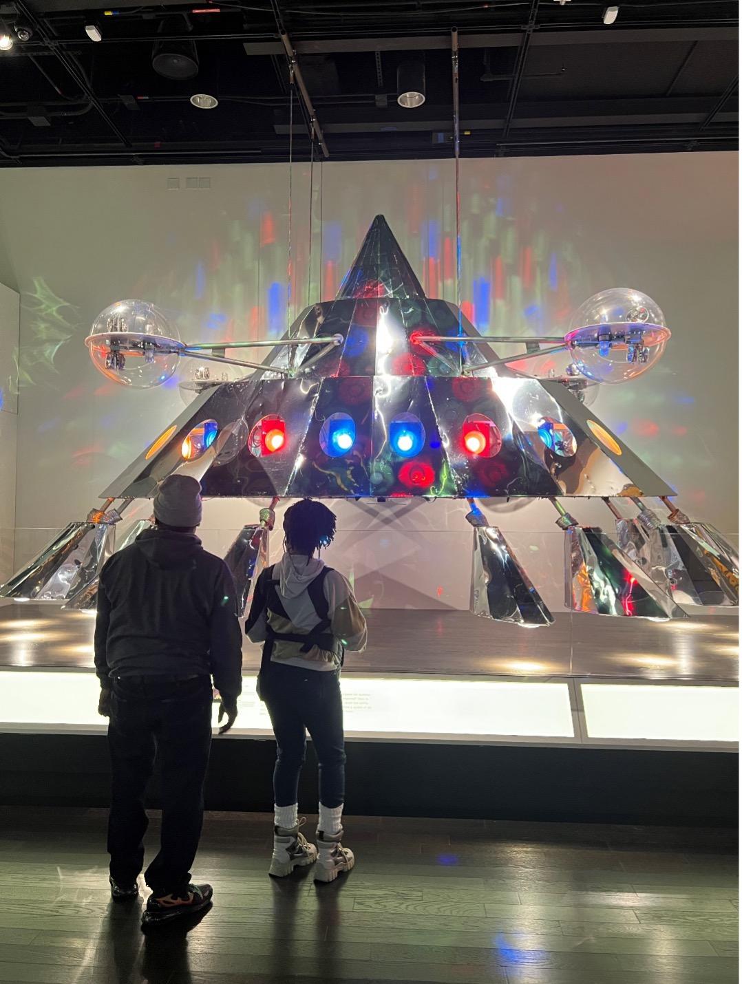 One of the band’s most iconic stage props, the Mothership, was a centerpiece of Parliament Funkadelic’s live performances and demands the attention of museum goers. Enormous and sparkling, the ship stands at over 20 feet tall and weighs 1200 pounds. It represents deliverance with the power to transport audiences away from oppression into a liberated cosmos.