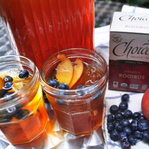 Conventional iced tea gets a unique upgrade from Choice Organic Fair Trade Certified Rooibos, a caffeine-free South African herb prized for its restorative qualities. Steep with peaches, blueberries and honey for an all-natural pick-me-up that’s brimming with the flavors of the season.
