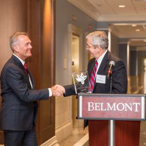 Dave Regnery, president of Heating, Ventilation, and Air Conditioning Commercial for North America, Europe, Middle East and Africa at Ingersoll Rand, presented the award today to Steve Lasley, vice president, Finance and Operations at Belmont University at an awards ceremony held in the R. Milton and Denice Johnson Center on the Belmont University campus.
