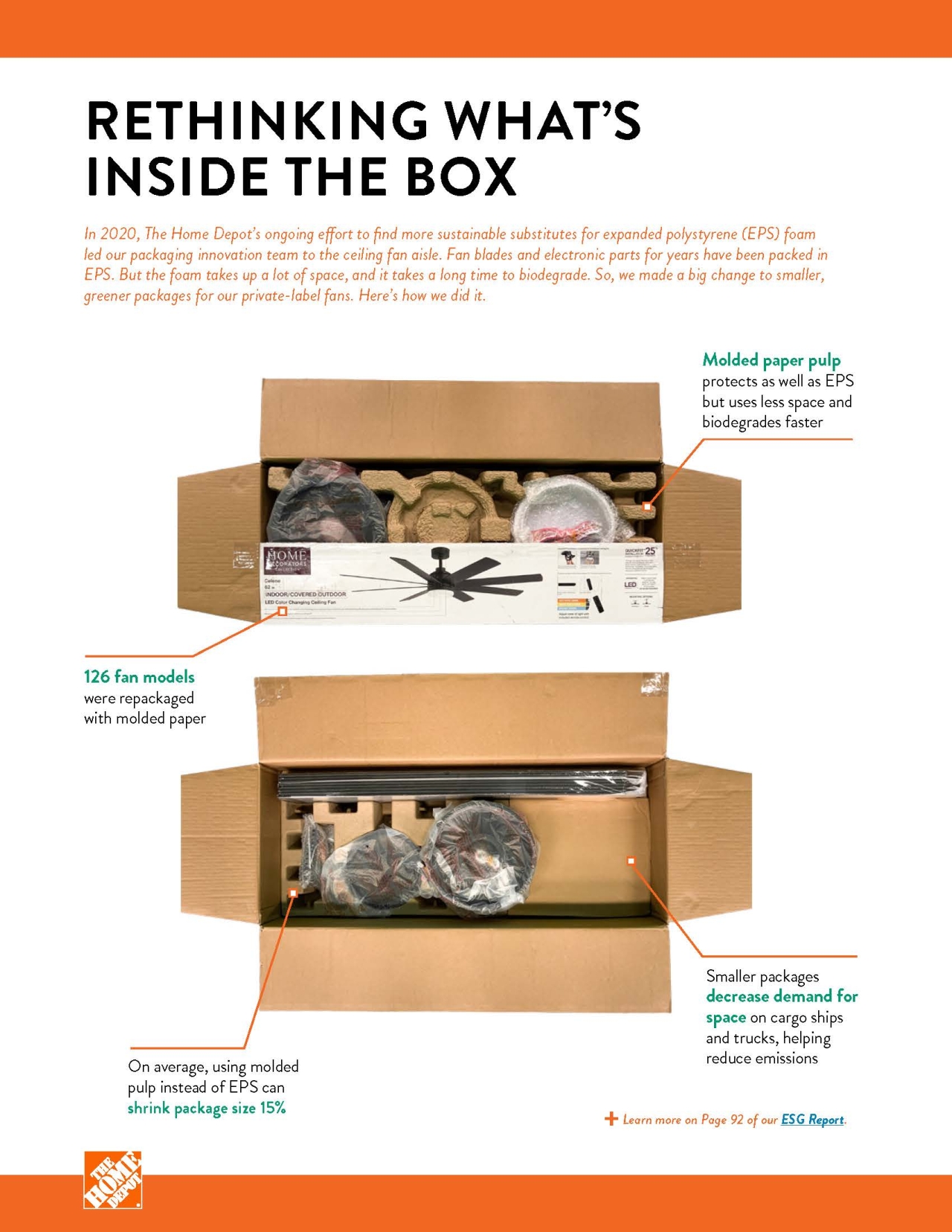We have sustainability goals as a company, such as our sustainable packaging initiative. The Home Depot has pledged to exclude expanded polystyrene (EPS) foam and polyvinyl chloride (PVC) film from private label packaging by the end of 2023. Our team is responsible for ensuring that pledge is met by securing alternative materials. The challenge is not getting rid of something, it’s finding a substitute that is abundant, performs as well and doesn’t cost more. When we commit to doing the right thing, such as removing hard-to-recycle plastics from our packaging, we commit to doing so without increasing customer prices.