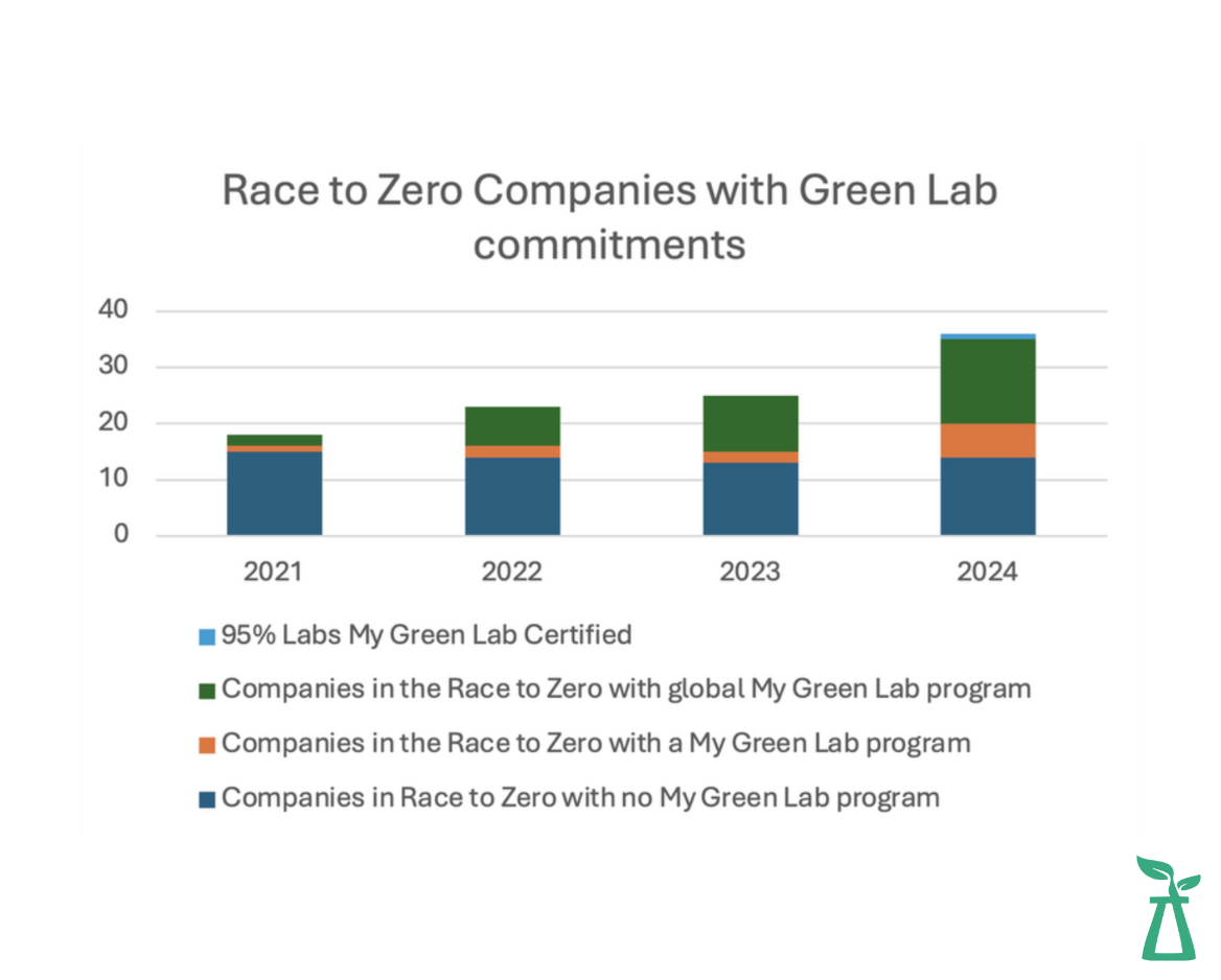 My Green Lab Certification drives Scope 1 and 2 emissions reductions by improving lab sustainability and supports Scope 3 reductions by encouraging sustainable purchasing and supply chain practices. It was chosen as a Race to Zero Breakthrough Outcome to help pharma and biotech companies reach a zero-carbon future by 2050.
