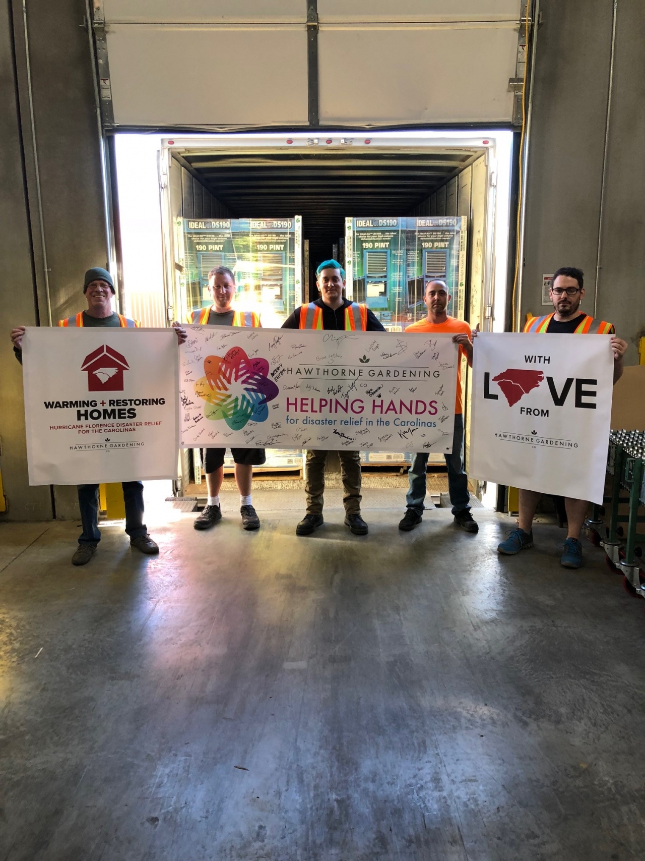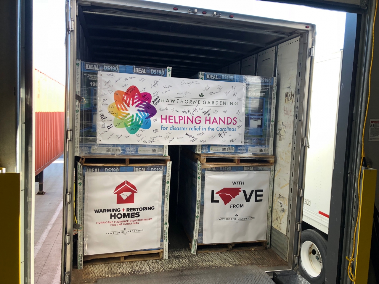 Meanwhile, 3,000 miles away, Hawthorne Gardening associates in Vancouver, Wash., (Sunlight Supply) were putting together one of the largest donations in ScottsMiracle-Gro’s history. With a retail value of more than $1.2 million, eight trucks full of Hurricane fans and Hurricane space heaters as well as Ideal-Air dehumidifiers were sent across country — four trucks each to North and South Carolina.