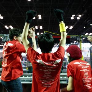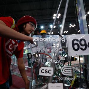 Saturday marked the first day of competition. Teams returned to the Javits Center with their mentors, teachers, families, friends and fans for a full day on the competition field. The contagious excitement and energy of the event continued on Sunday where five Bloomberg sponsored teams made it to the semi-finals, two finishing second including BOB Mentor, Becky Chu’s team, the G-House Pirates.Becky Chu, from UX Design in NYC, felt closely connected to her team “– a team that grows, learns, and experiences together (both for the good and bad). When you put in the time and effort to know the individual members of the team and to work with them throughout the build season, you have a stake in how they perform during competition and it becomes a very personal experience. Exposure to competition, robots, teamwork, the Javits Center — all of it — really does have an impact on young people and shapes what they do in the future. That’s the best part of all.”