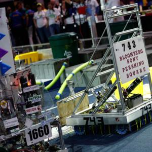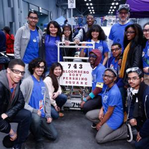 The competition marked the culmination of a 6 week robot building journey for the 47 Bloomberg Mentors and their 13 robotics teams. “Recycle Rush” was the theme of the 2015 competition in which the teams’ robots scored points by stacking totes on scoring platforms, capping them with recycling containers and discarding pool noodles, representing litter.