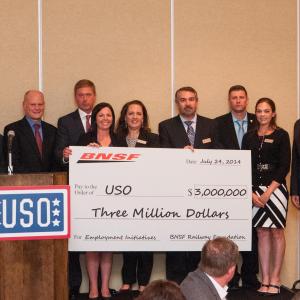 The BNSF Railway Foundation has announced a $3 million pledge to the USO that will support USO hiring initiatives for active duty men and women transitioning out of the military. The donation represents a three-year commitment to the USO’s mission to support our nation’s military veterans. With its pledge, BNSF becomes the primary sponsor for the USO program.