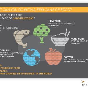 BNY Mellon employees will also be partnering with Canstruction®, an international nonprofit, to build giant structures out of canned food in five of its largest cities. The structures, which together will be built from approximately 17,000 cans of food, were chosen to spotlight different issues related to food insecurity – an apple (Boston), rice bowl (Hong Kong), fish (London), apple tree (New York) and globe (Pittsburgh). All the food items used to build them will be donated to local food banks. BNY Mellon expects its structures to contribute more than 12,000 pounds of food and help its community partners provide more than 9,000 meals to people who are hungry.