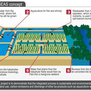 In the coming year, SBRC scientists will create a test ecosystem by planting two crops of halophytes in Abu Dhabi’s sandy soil. Waste seawater from a fish and shrimp farm will nourish halophytes that clean the water as they grow. The water will next flow into a field of mangroves before returning to the ocean. Both plants would be converted into aviation biofuel using SBRC research findings.
