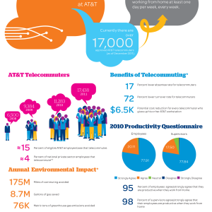 At AT&T a number of our employees take advantage of Telecommuting. We have seen substantial benefits from reduced absentee rate, lower turnover rate and cost reductions. Of course and very importantly, we are seeing beneficial environment improvements as well. Take a look at what we here at AT&T see as benefits of telecommuting in our (Infographic).
