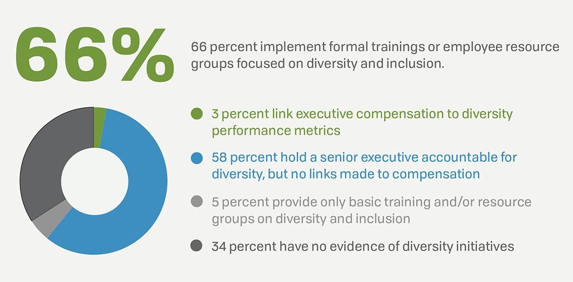 Despite these gains, change is not happening fast enough. Women in the U.S. still earn about 80 cents on the dollar compared to their male co-workers. And those cents pile up, with women losing up to $800,000 during an average lifespan. Even with the growing value of a diverse and inclusive workplace, few companies are taking the necessary steps to incentivize actual change in hiring and retention practices. Our analysis shows just 3 percent of the U.S. companies assessed link executive compensation to diversity performance metrics.