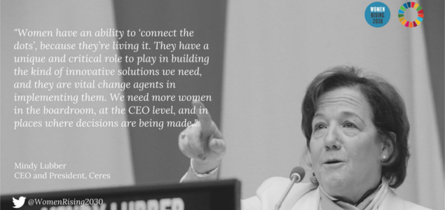 Released by Women Rising 2030, the new report features analysis showing that corporate boards with greater gender diversity are more apt to invest in renewable power generation and energy efficiency. It highlights women leaders in all sectors helping businesses gain crucial ground in reaching the UN Sustainable Development Goals (SDGs) and points to widespread positive impacts across all of the SDGs when companies commit fully to goal number five: gender equity.“Women have an ability to ‘connect the dots’, because they’re living it,” Ceres CEO and President Mindy Lubber told the report authors. “They have a unique and critical role to play in building the kind of innovative solutions we need, and they are vital change agents in implementing them. We need more women in the boardroom, at the CEO level and in places where decisions are being made.”