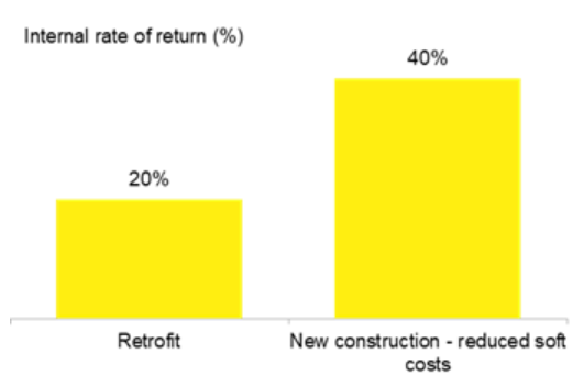 The economic case for adding solar during construction of new buildings is particularly strong. This is because so-called ‘soft costs’, such as marketing and sales costs, as well as labor and construction costs, can be reduced, while the benefits remain the same. In California, the economic case for adding residential solar on existing homes is already good at 20% IRR, but the new report estimates that this figure is twice as high, at 40% IRR, when solar is added at the point of construction. In France, the IRR for residential solar could be boosted to 28% when added during new construction.