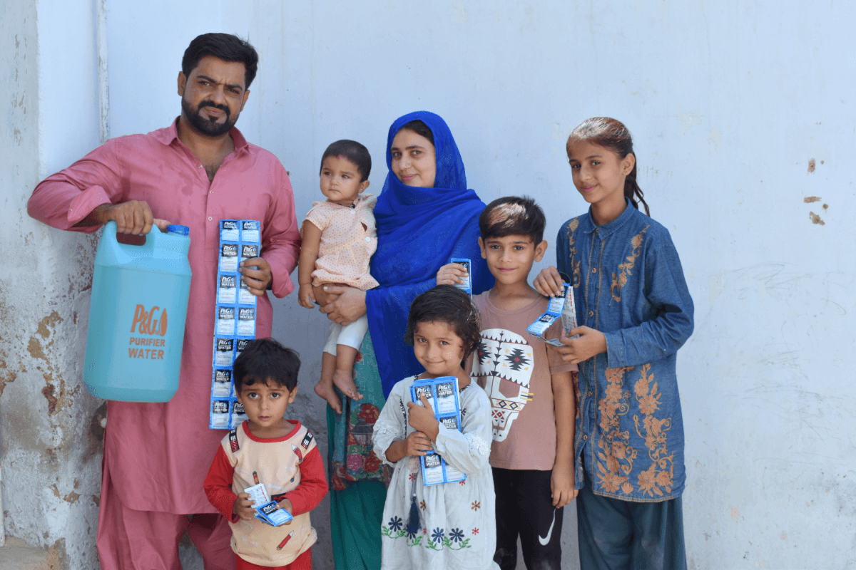 Our Children’s Safe Drinking Water Program plays an important role in helping enable good handwashing practices as the water used for handwashing needs to be clean to be effective. Since the not-for-profit program started in 2004, we have worked closely with more than 150 global partners to provide 19 billion liters of clean water in more than 90 countries around the world. We are well on our way to achieving our goal to reach 25 billion liters provided by 2025. We’re proud to celebrate this milestone anniversary with our charity partner HOPE who distributes much-needed P&G Purifier of Water packets in Pakistan to people like Allah B. and his family. Allah B. (75) lives with his wife Rahmia (70), their son Allah Rakha (45), daughter-in-law Sakina (30) and their five children Rasheed (10), Salma (9), Razia (5), Ameeran (2) and Gulzar (11 months).
