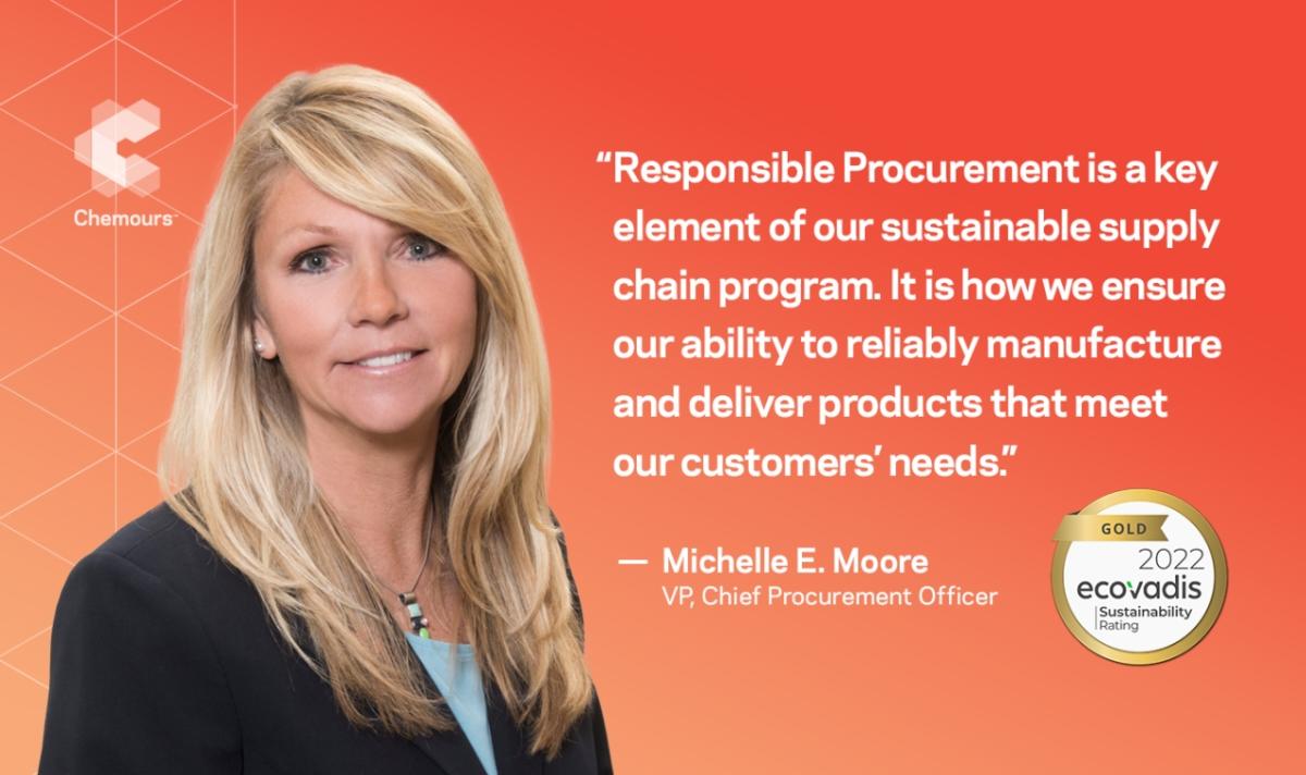 “Sustainability is part and parcel of Chemours vision and strategy, and we are extremely proud to achieve this gold recognition from EcoVadis,” said Michelle Moore, Chief Procurement Officer at Chemours. “Responsible Procurement is a key element of our sustainable supply chain program. It is how we ensure our ability to reliably manufacture and deliver products that meet our customers’ needs. We view our suppliers as an extension of ourselves, and we are committed to working with those who share our commitment to operating responsibly and adding value for Chemours and our customers.”