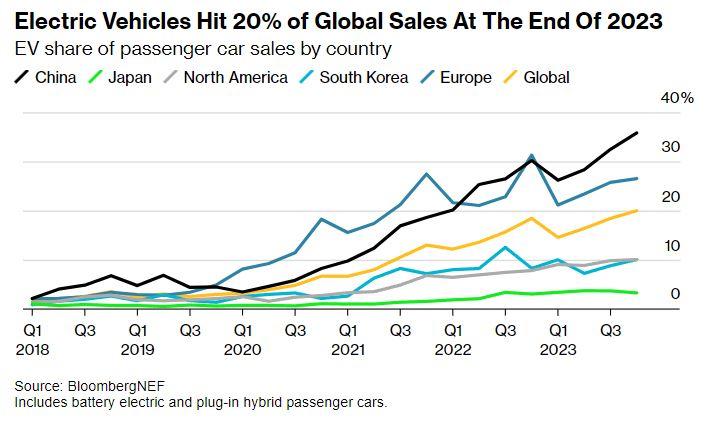 On the passenger vehicle side, BNEF estimates that EVs reached 20% of global vehicle sales in the final quarter of last year. China and Europe are way out ahead, but it was a record quarter in other markets, as well.