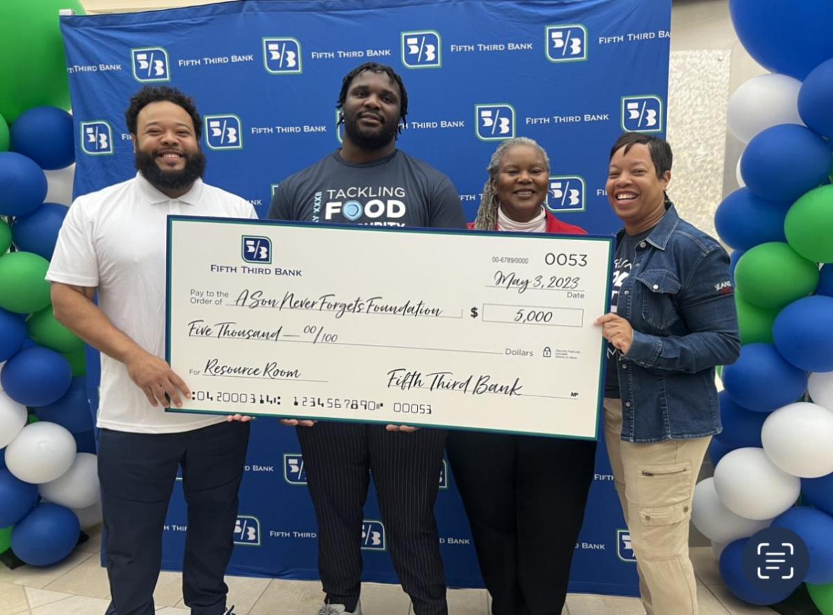 In celebration of Fifth Third Day (May 3 or 5/3 on the calendar), Fifth Third presented a check in the amount of $5,000 to A Son Never Forgets Foundation. The foundation was established by Cincinnati Bengals Defensive player DJ Reader in honor of his mother and father. The Foundation focuses on providing positive messages surrounding health, wellness and the importance of education.
