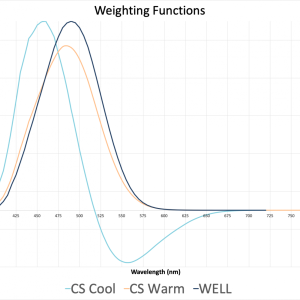 The circadian stimulus model has two separate weighting functions, depending on the characteristics of the light. Warm light (<3500K) would use the “warm” weighting function and cool light (>3500K) would use the “cool” weighting model. The model will determine which weighting factor shall be applied. Each of these weighting curves appear on Figure 1 below. Note, the “warm” weighting function has a peak sensitivity of 485 nm, which is similar to the 490nm from the Melanopic lux model.