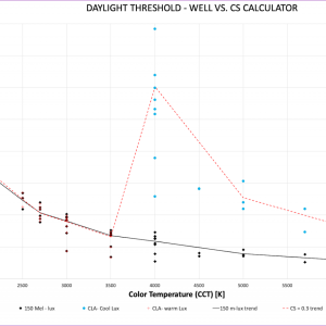 - When applying the CS “cool” weighting function, it requires more vertical foot-candles to achieve a CS = 0.3 than it does to achieve 150 melanopic lux.