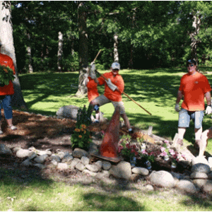 Twenty-five CITGO Lemont Refinery Community Action Team members worked on June 5, 2012 to beautify the Shady Oaks Camp grounds by cutting grass, planting flowers, and pulling weeds. The team also brought in construction equipment to move large piles of cement blocks and gravel.