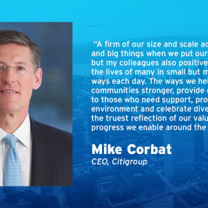 “The ways Citi helps make our communities stronger, provide opportunities to those who need support, protect our environment and celebrate diversity are the truest reflection of our values and the progress we enable around the world,” said Citi CEO Michael Corbat. “This report highlights the innovative ways – big and small – we are demonstrating the positive impact we have on society.”
