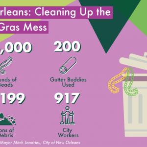 In New Orleans, which recently wrapped up its Mardi Gras celebrations, the city deployed 917 worker (a mix of city workers, temporary workers, and contractors) to clean up 1,199 tons of debris. The beaded necklace, a Mardi Gras staple, had proved to be a toxic headache for the city. Between September 2017 and January 2018, of the 7.2 million pounds of debris that was generated during that timeframe, 93,000 pounds of that were Mardi Gras beads alone that were retrieved from 15,000 catch basins throughout the city.