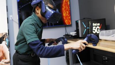 Hands down, VR is his favorite activity in the 5G Innovation Learning Lab at Entrepreneurship Prep (Cliffs Campus). “VR is really cool because it’s like stepping into a new universe,” Khalid says, sticking his face into the virtual sun for fun. “It feels like technology on top of technology.”