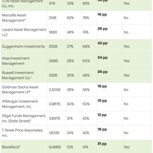 2021 brought a doubling in the number of climate proposals winning majority votes to 15 from seven last year. On average, asset managers voted in favor of 63% of the climate related shareholder proposals before them in 2021. Furthermore, nearly three-quarters of 58 large asset managers studied by Ceres voted in favor of more than half of the climate-related proposals before them. And the two largest asset managers, BlackRock and Vanguard, dramatically increased their votes in favor, helping to propel the historic success. This contributed not only the majority votes, but also to the average vote on climate-related proposals leaping to 41% this year from 31% last year.