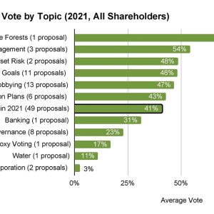 In a year when unprecedented floods, wildfires, and hurricanes across the U.S. led to hundreds of deaths and an estimated $125 billion in damages, it is clear that more investors than ever recognize the enormous financial risks posed by the climate crisis. Our analysis of voting on 49 climate proposals found that the historic success of climate-related shareholder proposals during the 2021 proxy season resulted in large part from a dramatic increase in votes for these proposals by the world’s largest asset managers.