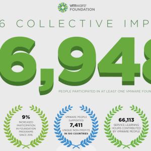 The VMware Foundation’s 2016 Collective Impact infographic reflects how employees contributed their time, talents, and resources to the causes closest to their hearts. In 2016, 16,948 VMware employees worldwide (that’s 85 percent of VMware’s community) joined the VMware Foundation in giving back by supporting more than 7,400 nonprofits in 100 countries. Individual actions matter, and when you add up VMware people’s individual contributions, you’ll find a global network of giving. This is the power of collective impact.