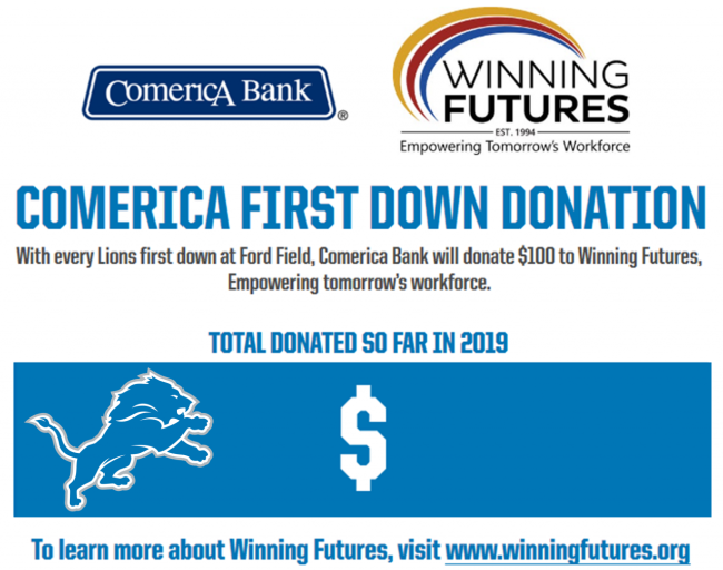 DETROIT, MI, September 13, 2019 /3BL Media/ –With each Detroit Lions first down gained this season at Ford Field, Comerica Bank will aid Winning Futures and the empowerment organization’s mission to prepare youth in metro Detroit for the workforce.