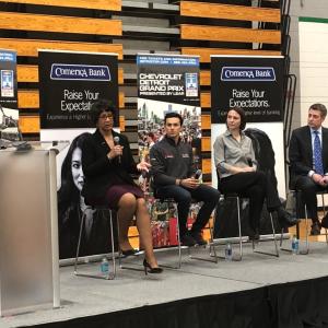 The event at Cass Tech celebrated the return of Comerica Bank Free Prix Day and featured a panel discussion with Comerica Bank Executive Vice President and General Auditor – and Cass Tech graduate – Christine Moore; IMSA WeatherTech SportsCar Championship winning driver, Pipo Derani; Cadillac Racing Program Manager, Laura Klauser, along with Montri.